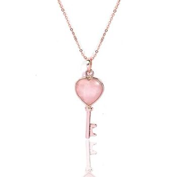 Gempro Genuine Rose Quartz Valentine's Heart Key Rose Gold Plated Chain Pendant Necklace for Women, Pink